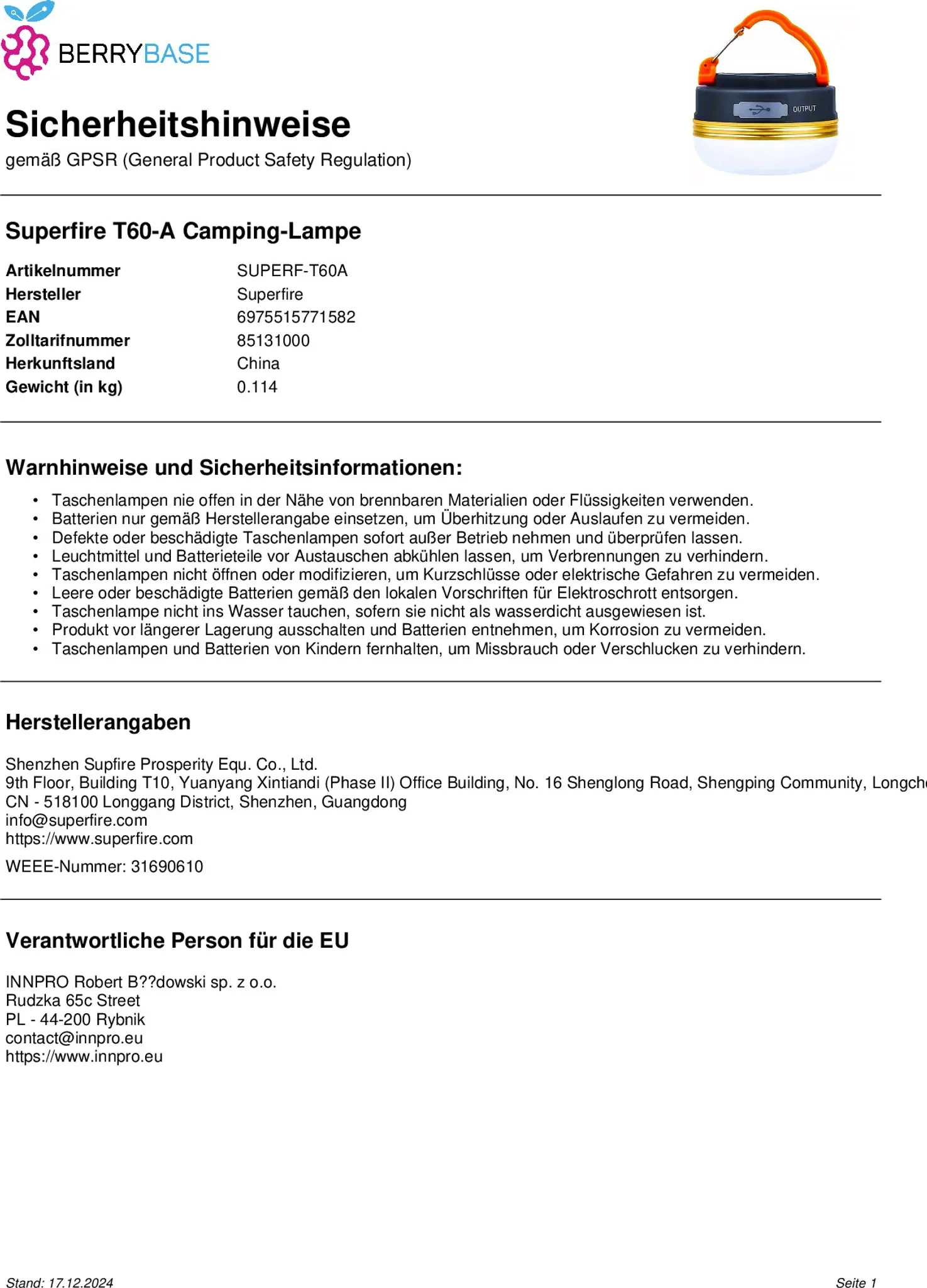 | Produkttyp | Campinglampe |