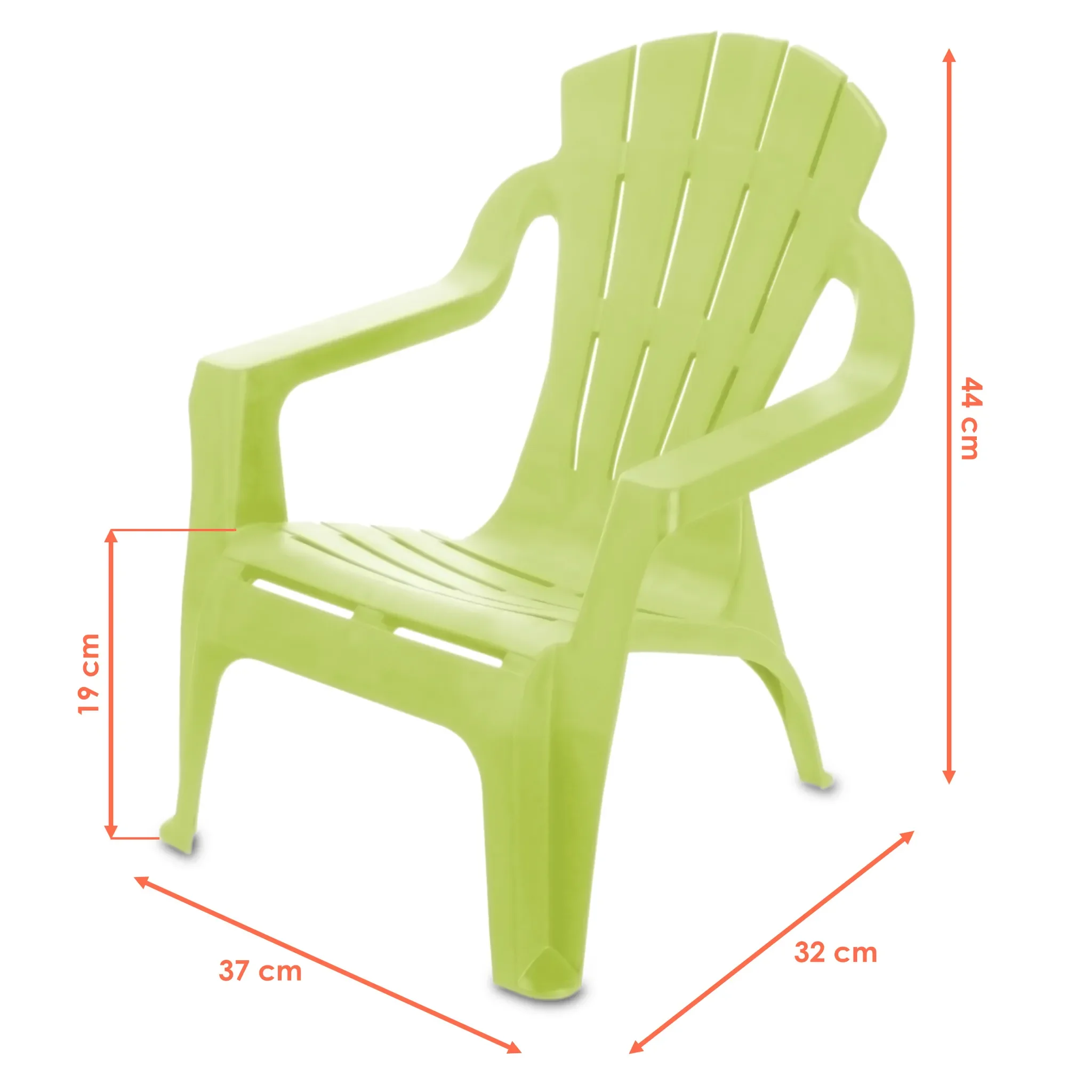 Dieser grüne Kinder Lounge Gartenstuhl aus Kunststoff ist speziell für Kleinkinder konzipiert und bietet eine bequeme Sitzgelegenheit für Garten, Terrasse oder Balkon. Die integrierten Armlehnen sorgen für zusätzlichen Komfort und sicheren Halt.