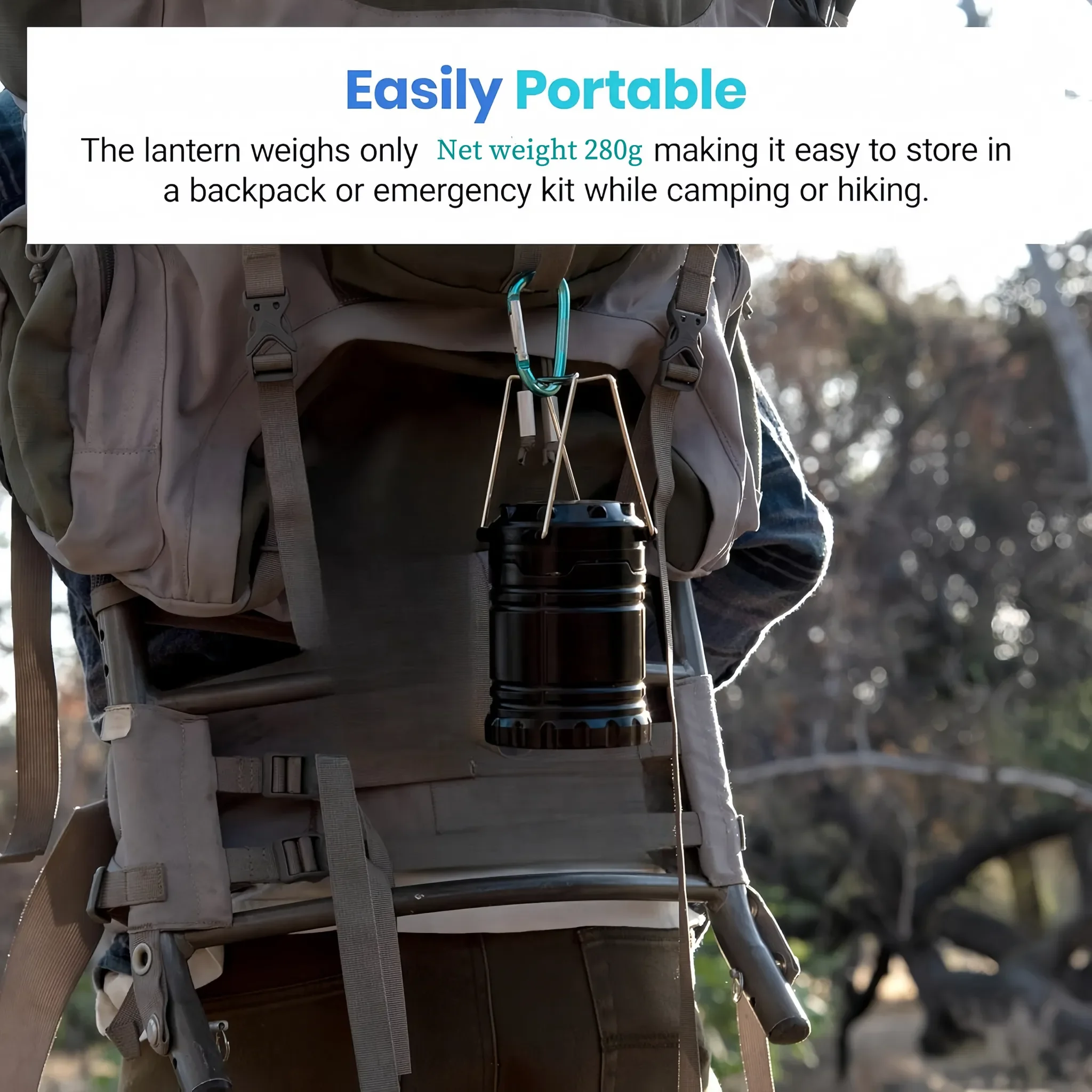Dank des faltbaren Designs lässt sich die Lampe platzsparend transportieren – kaum größer als ein Smartphone. Über das Ausziehen oder Zusammenschieben der Laterne wird sie ein- und ausgeschaltet sowie die Helligkeit reguliert. Der integrierte Haken ermöglicht das einfache Aufhängen im Zelt, am Rucksack oder im Innenraum.