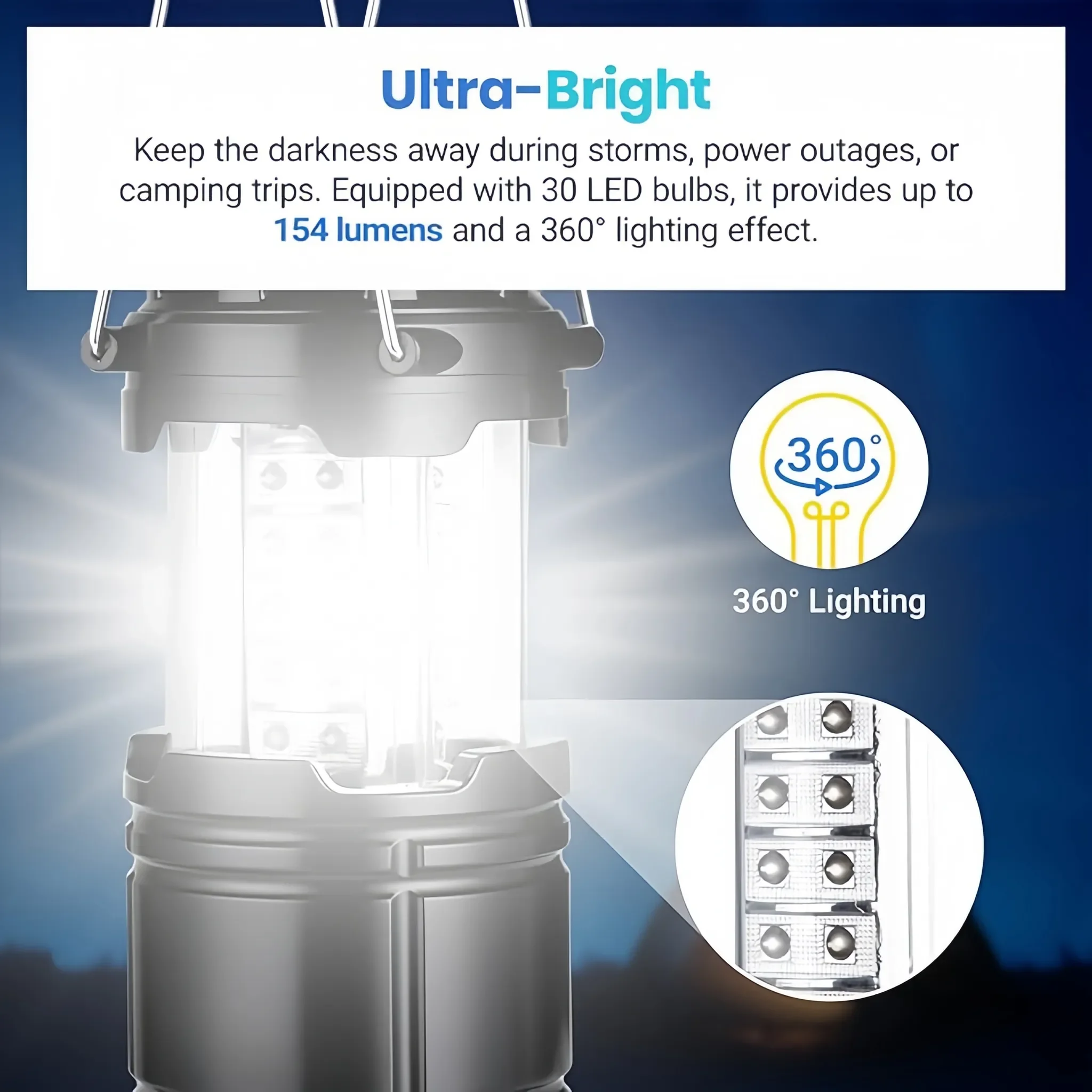 Dieses kompakte LED-Campinglicht ist eine praktische und vielseitige Lichtquelle für Camping, Wandern, Reisen oder den Notfall zu Hause. Mit 30 hellen LEDs erzeugt die Laterne eine gleichmäßige 360°-Ausleuchtung und erreicht eine Lichtleistung von bis zu ca. 154 Lumen.
