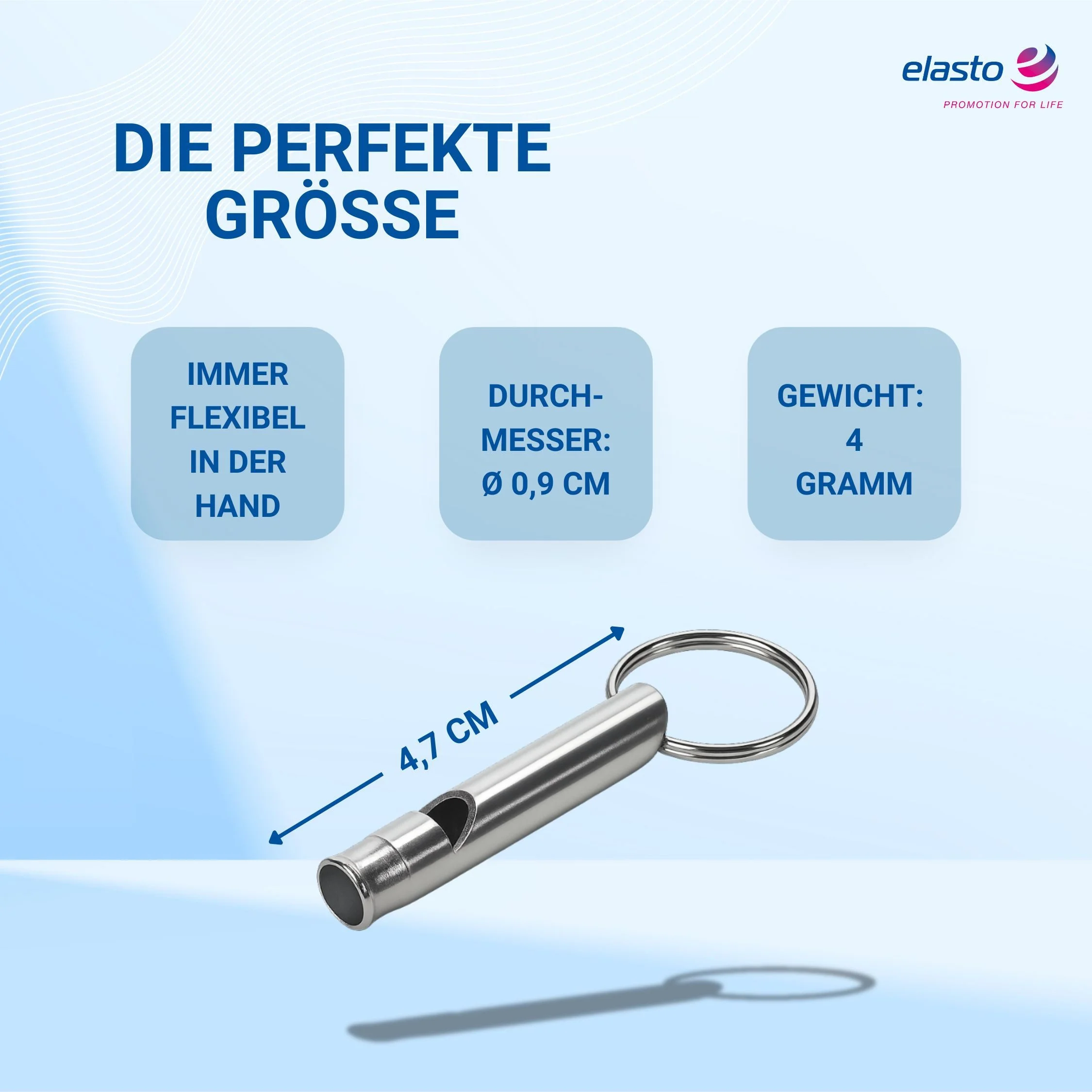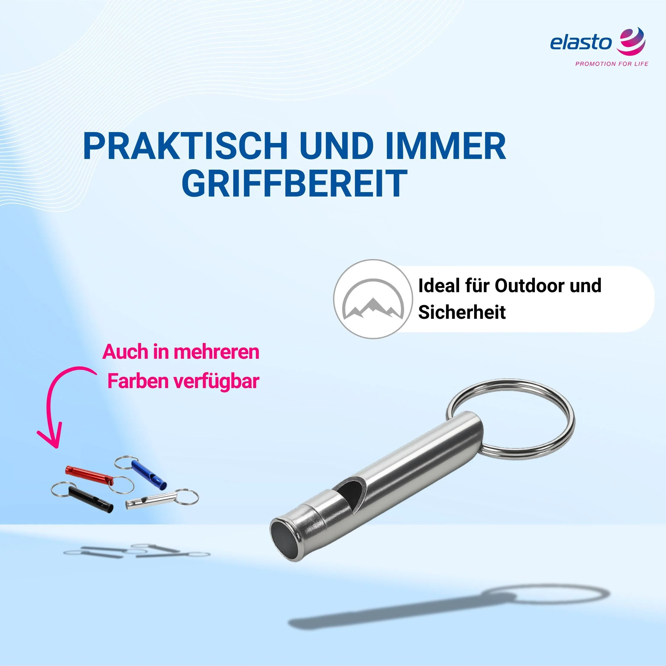 Highlights: Hochwertiges Aluminium, kompaktes Format, immer griffbereit dank Schlüsselring und zuverlässiger, durchdringender Signalton für viele Einsatzbereiche.