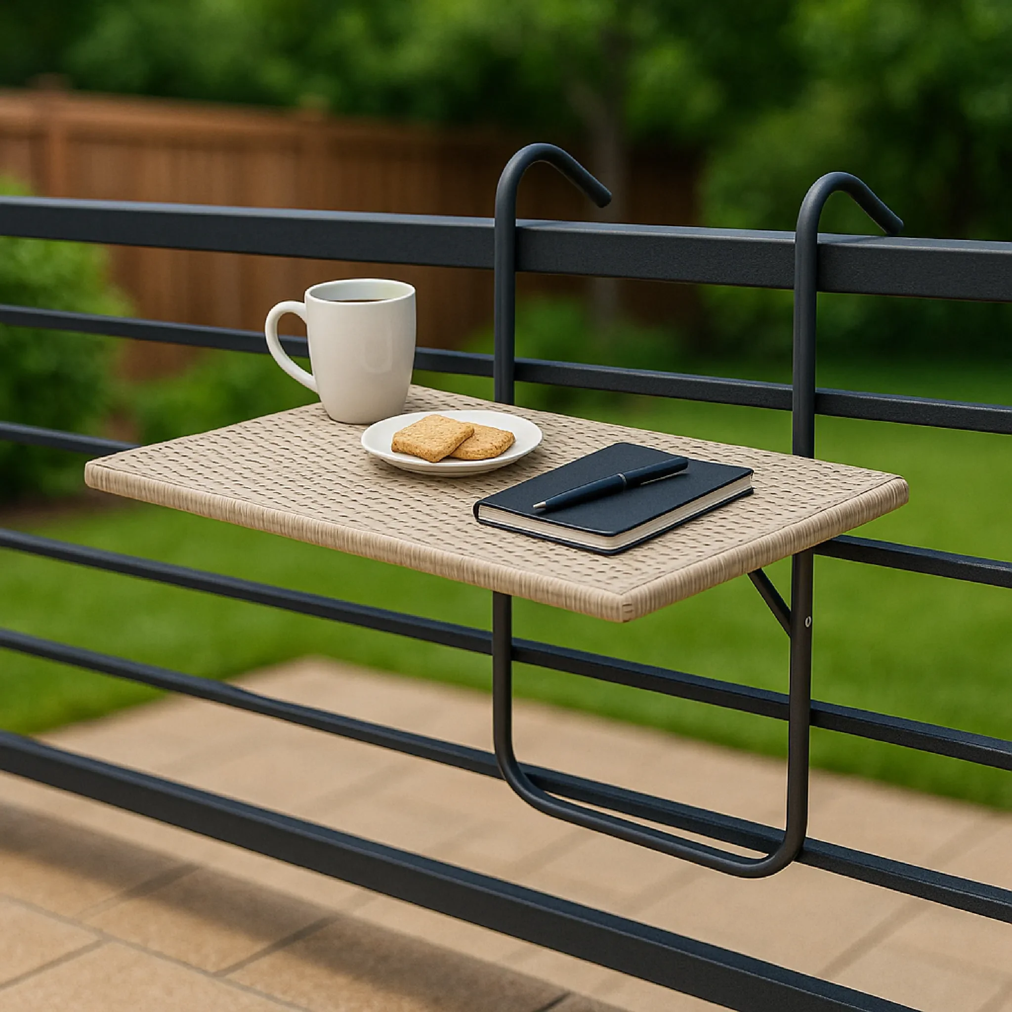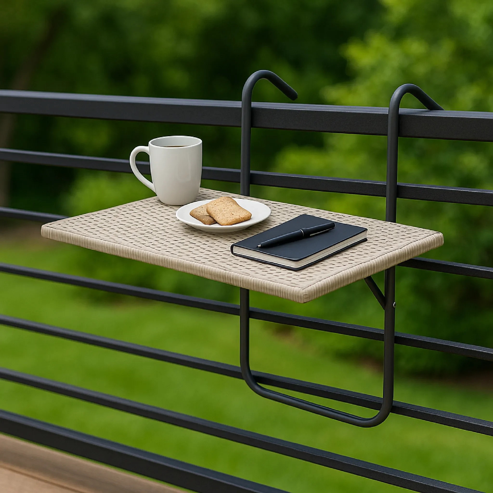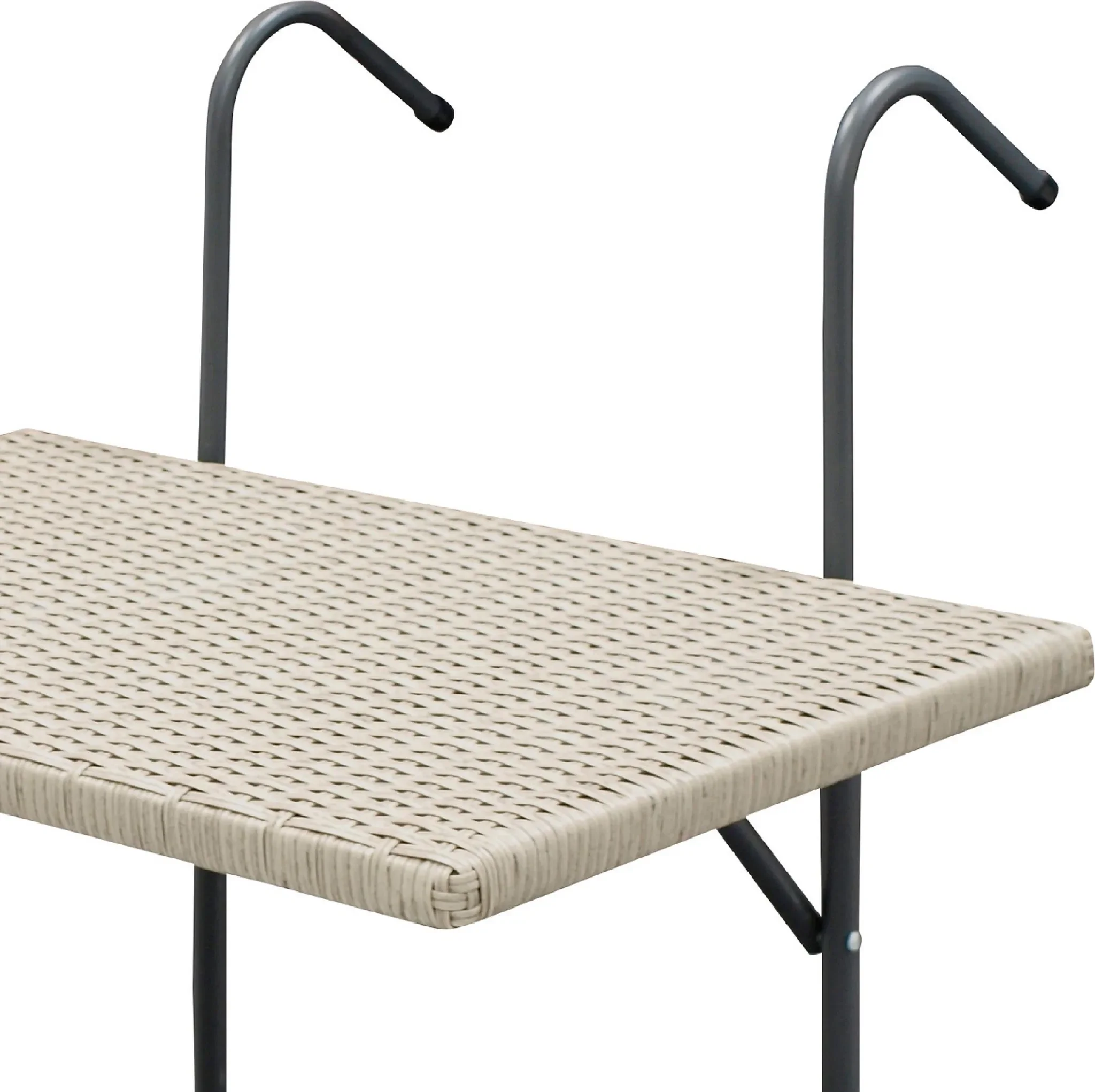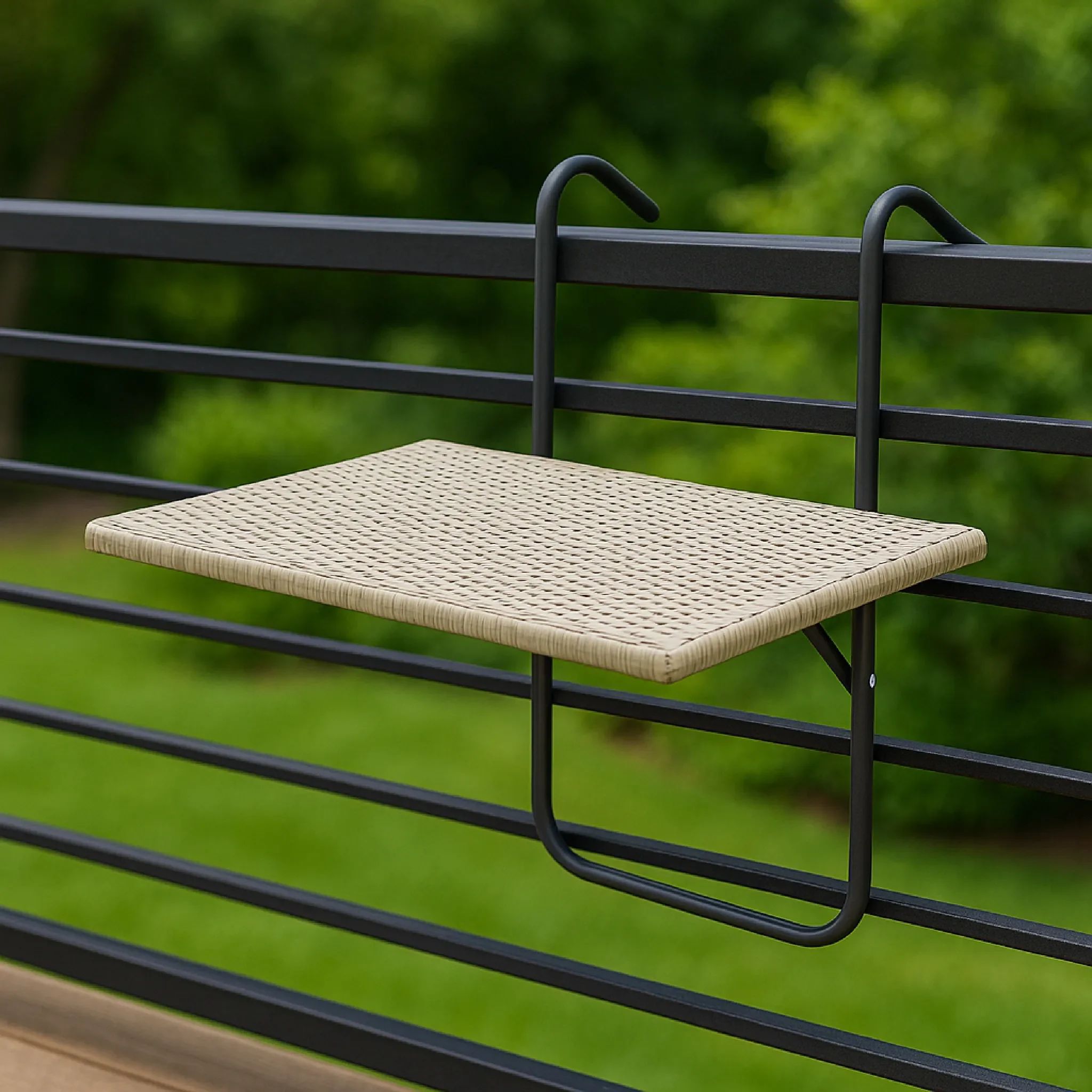 Das stabile Metallgestell sorgt für sicheren Halt an der Balkonbrüstung, während die graue Polyrattanbespannung dem Tisch eine moderne, zeitlose Optik verleiht. Ideal für Kaffee, Getränke, Snacks oder kleine Dekorationen im Außenbereich.