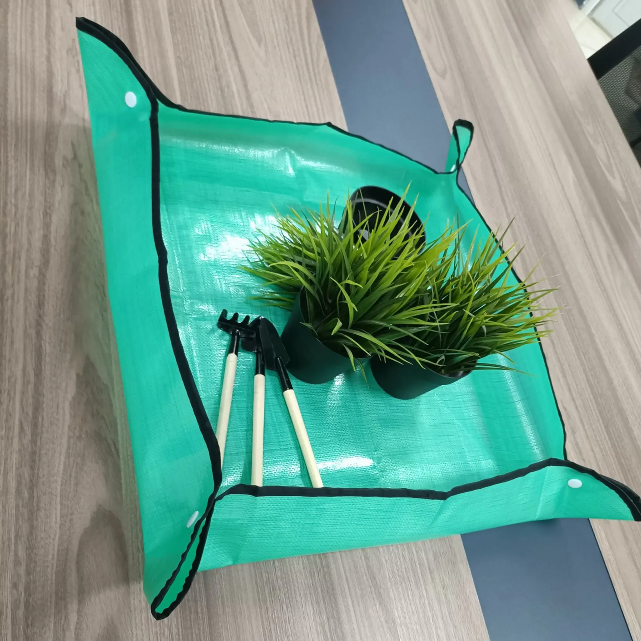 Die Matte besteht aus hochdichtem PE-Gewebe, ist beidseitig wasserdicht, schmutzabweisend und besonders langlebig. Über Kupfer-Druckknöpfe an den vier Ecken lässt sie sich schnell zu einer flachen Schale formen, sodass Blumenerde, Wasser und Pflanzenreste sicher aufgefangen werden.